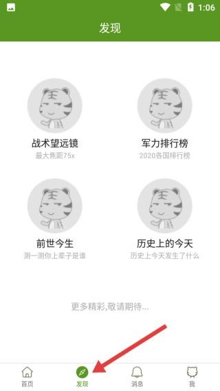 1、点发现页,展示战术望远镜、军力排行榜等功能,还有前世今生测试与历史上的今天板块。