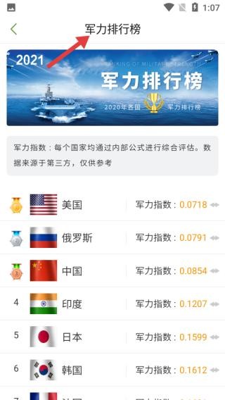2、点军力排行榜页面,呈现2021年数据,含美国、俄罗斯等国军力指数,数据源于第三方。