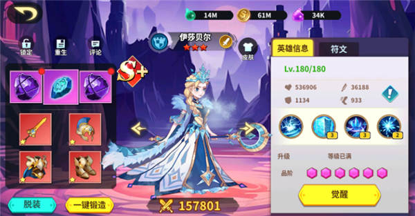 阵容成型后可重点培养神话级英雄伊莎贝尔,具有优秀的群伤和群控能力,一技能元素祈唤能够攻击所有敌人,并且有概率造成冰冻状态,同时降低敌方速度。伊莎贝尔获取难度较低,可通过完成荣誉勋章任务等方式领取。