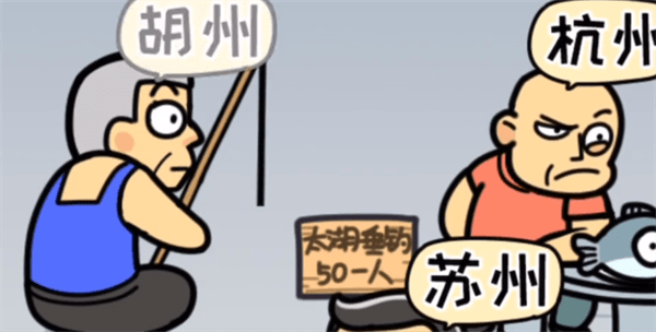 5、最后点三次鱼塘,长按下方芜字,拖动到湖州变成【胡洲】,拖动给大爷即可通关