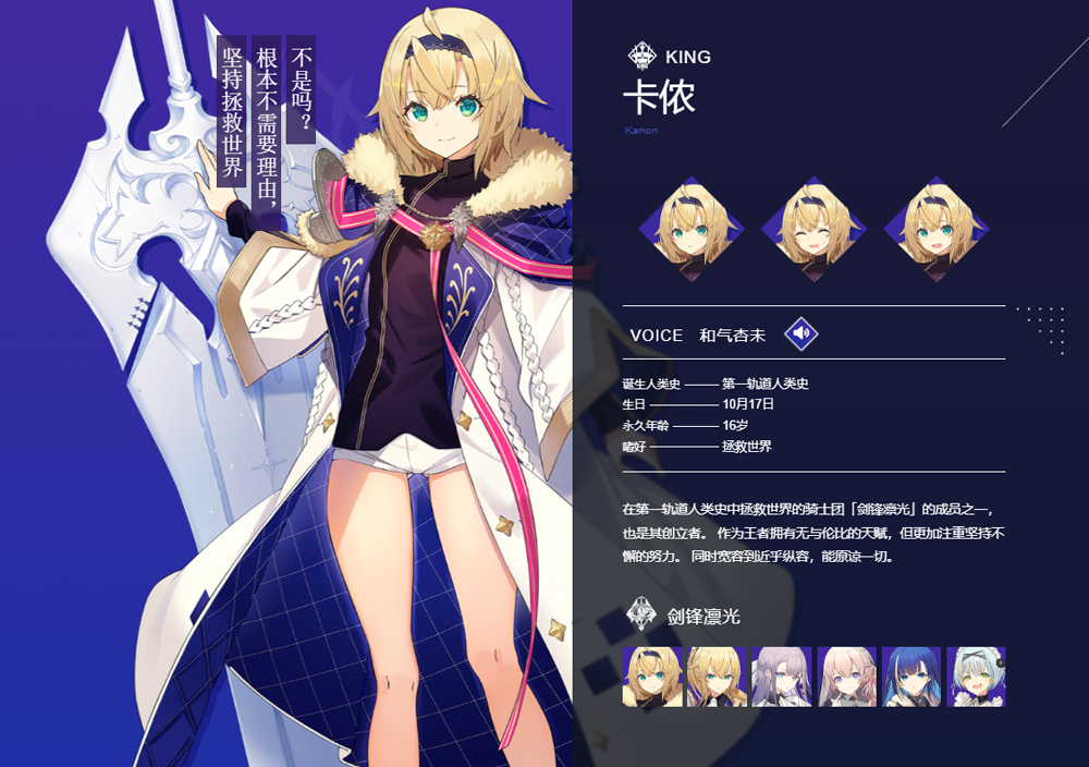 从诞生于第一轨道「剑锋凛光」的光荣战士,到第二轨道「千紫」的神秘巫女,再到第八轨道「零射橙」的元气少年,在这里,邂逅形形色色的「骑士」,建立与他们的羁绊吧!