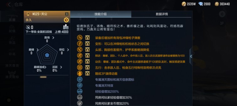 属性上,M12S-天公在装备后除了可以增加背包内所有的冲锋枪子弹数以及额外的经验金币值加成外,还拥有酷炫3P演绎动画以及专属击杀图标、消灭信息展示和消灭特效,击杀敌人后还会触发五行技能,连续击杀敌人时枪管上方会依次点亮金、木、水、火、土五行专属特效,酷炫十足。