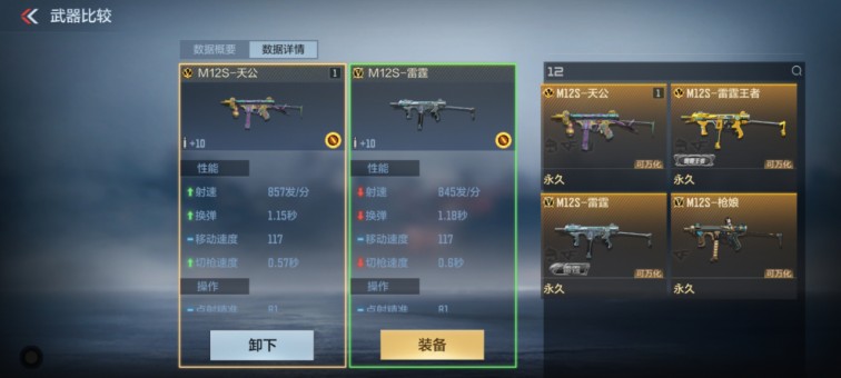 性能方面,M12S-天公凭借着857发/分的射速、1.15秒的换弹速度以及0.57秒的切枪速度优于M12S-雷霆和M12S-枪娘,略逊于M12S-雷霆王者。并且M12S-天公0.2的受击上抬高度超越了M12S家族内所有的受击上抬表现,在被敌人击中的时候会有更加稳定的表现效果。值得一提的是M12S家族都有满穿属性,对木制掩体后的敌人有奇效。