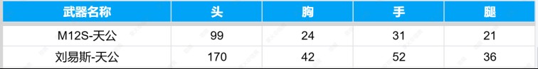 数据表现上,M12S-天公相较于非英雄级M12S来说在命中头部、胸部时伤害提升,护甲系数略微降低,面对开了脱甲技能的仲康可以说是天克。其基础伤害30点,中距离伤害16点,远距离伤害9点,伤害表现上持平M12S-雷霆王者,护甲系数变为了0.65,但得益于技能效果,M12S-天公伤害并不低,满精通贴脸状态下的伤害表现可以参考下表。