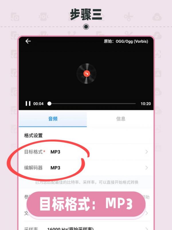 4、在弹出的“转换设置”界面中,选择目标格式为MP3。在本文中,我们将把wav文件转换成MP3格式,因此选择MP3格式作为目标格式。点击“确定”按钮,进入下一步操作。